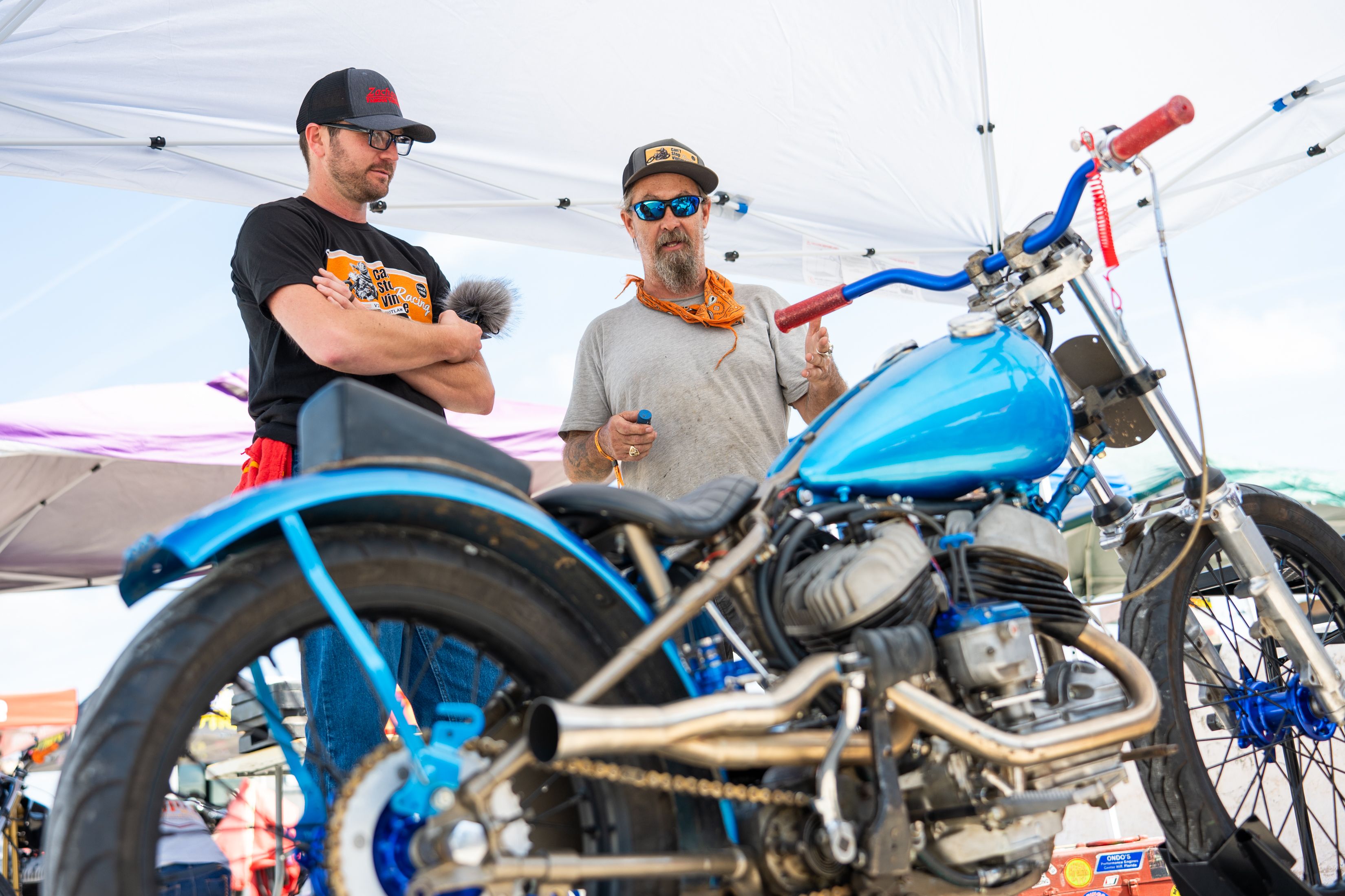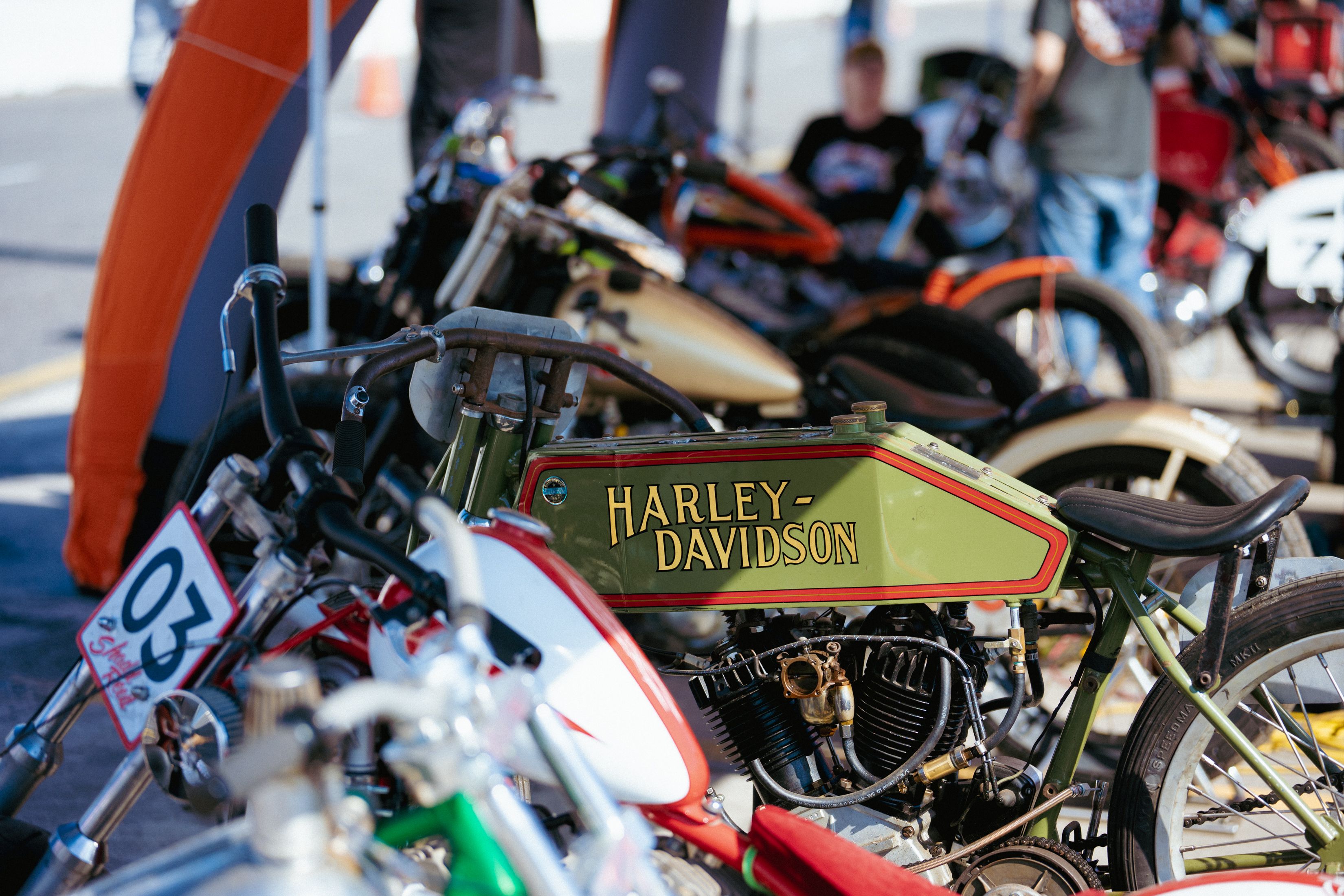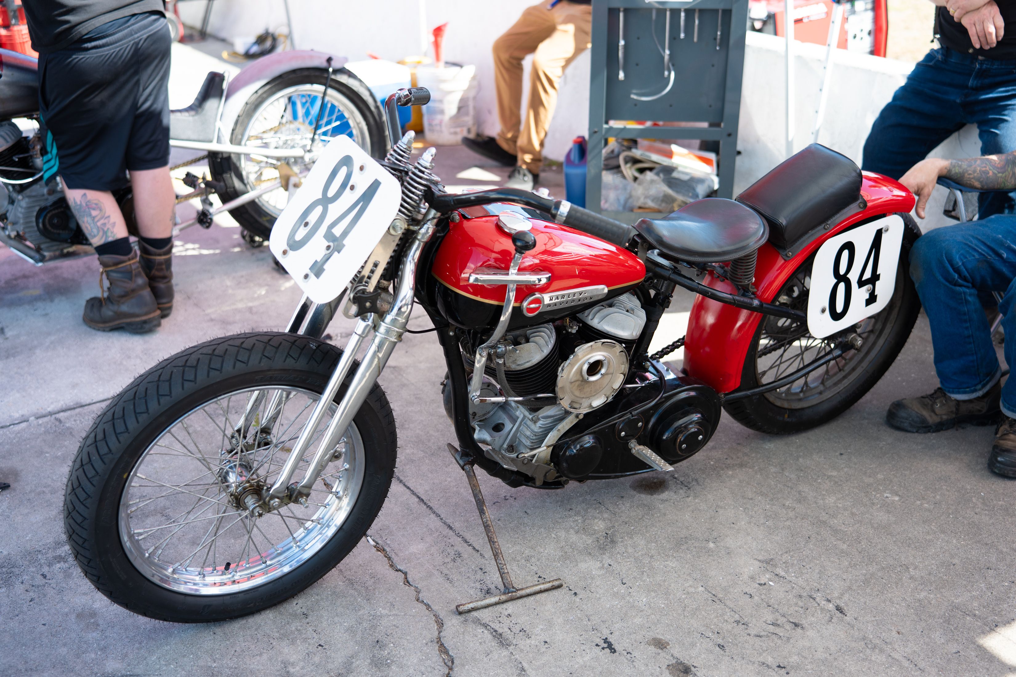 Instead, the pits look like a garage sale for American motorcycle history. Flathead Harleys. Knuckleheads. WR race motors. Hand-built frames and parts that feel closer to sculpture than engineering.